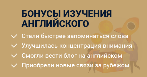 В Клубе английского языка вы получите всё, что необходимо для того, чтобы Вы достигли своего желаемого результата. А именно: авторская программа, в которой простым и понятным языком доносится материал, новейшие технологии ускоренного запоминания слов и фраз на английском языке. И самое главное - это мотивация (игровой формат), которая гарантированно приведет Вас к результату, и не позволит Вам остановиться и бросить обучение на полпути.